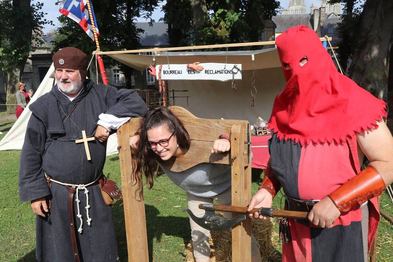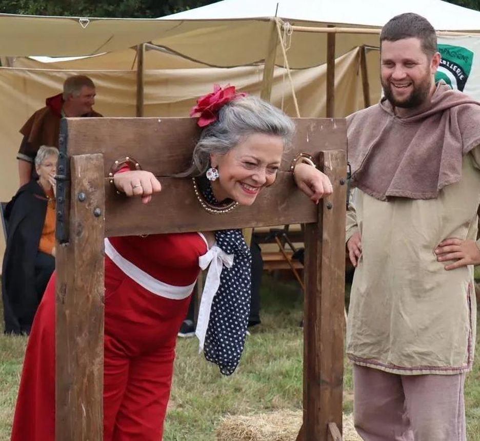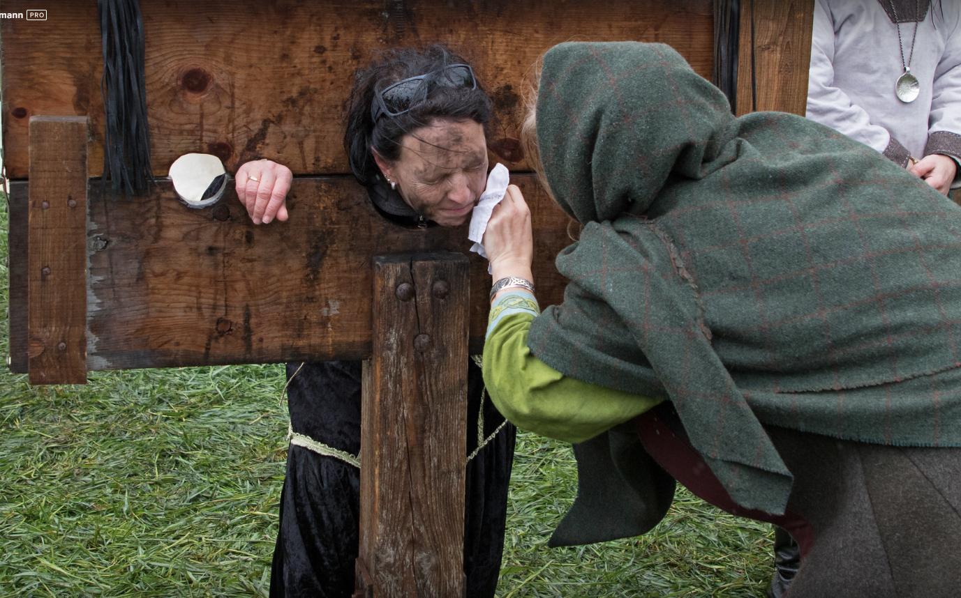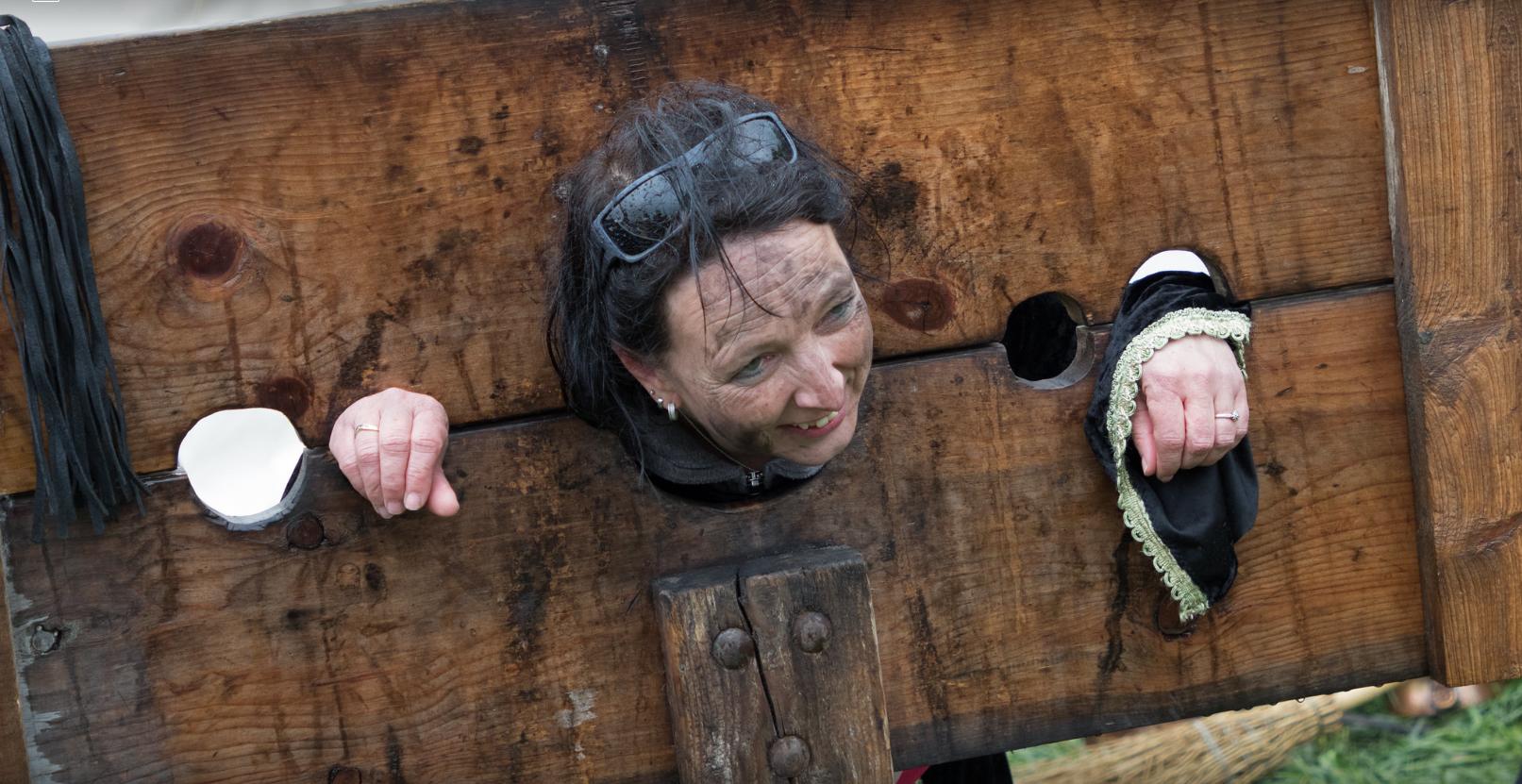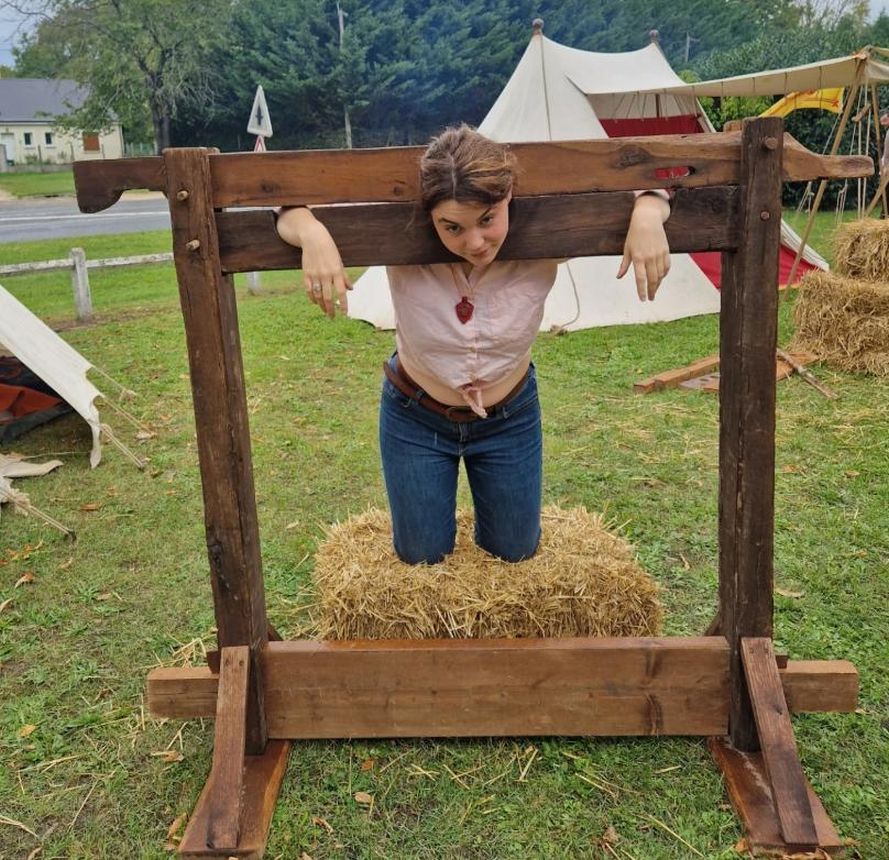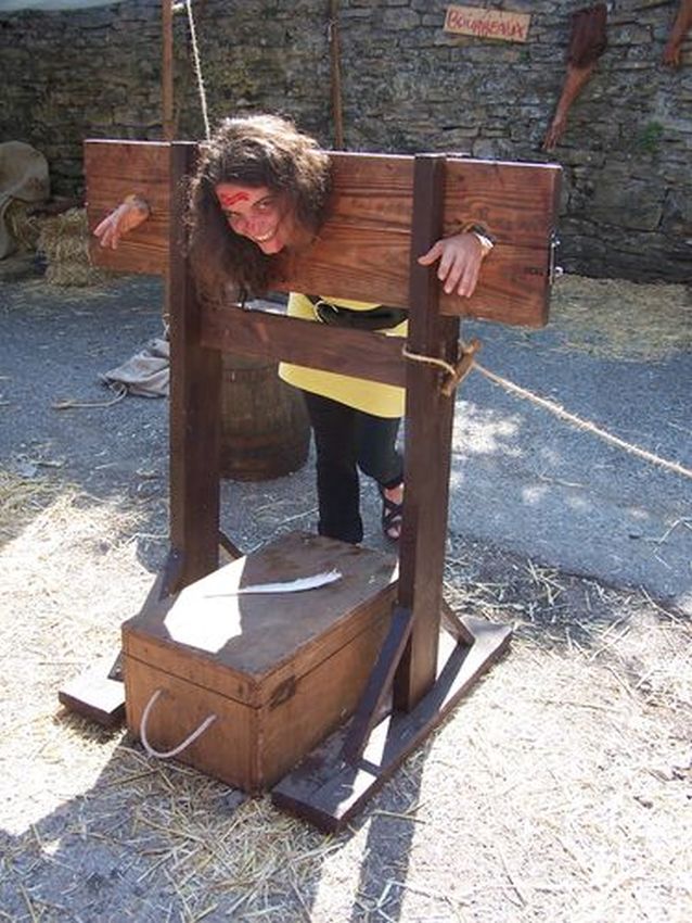 Another French fair. Stuck in a pillory and your hair is a mess? Then you need a visiting medieval hairdresser. A few expert tweaks and she's looking as chic as ever. Voila, c'est magnifique.