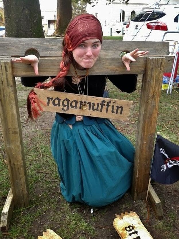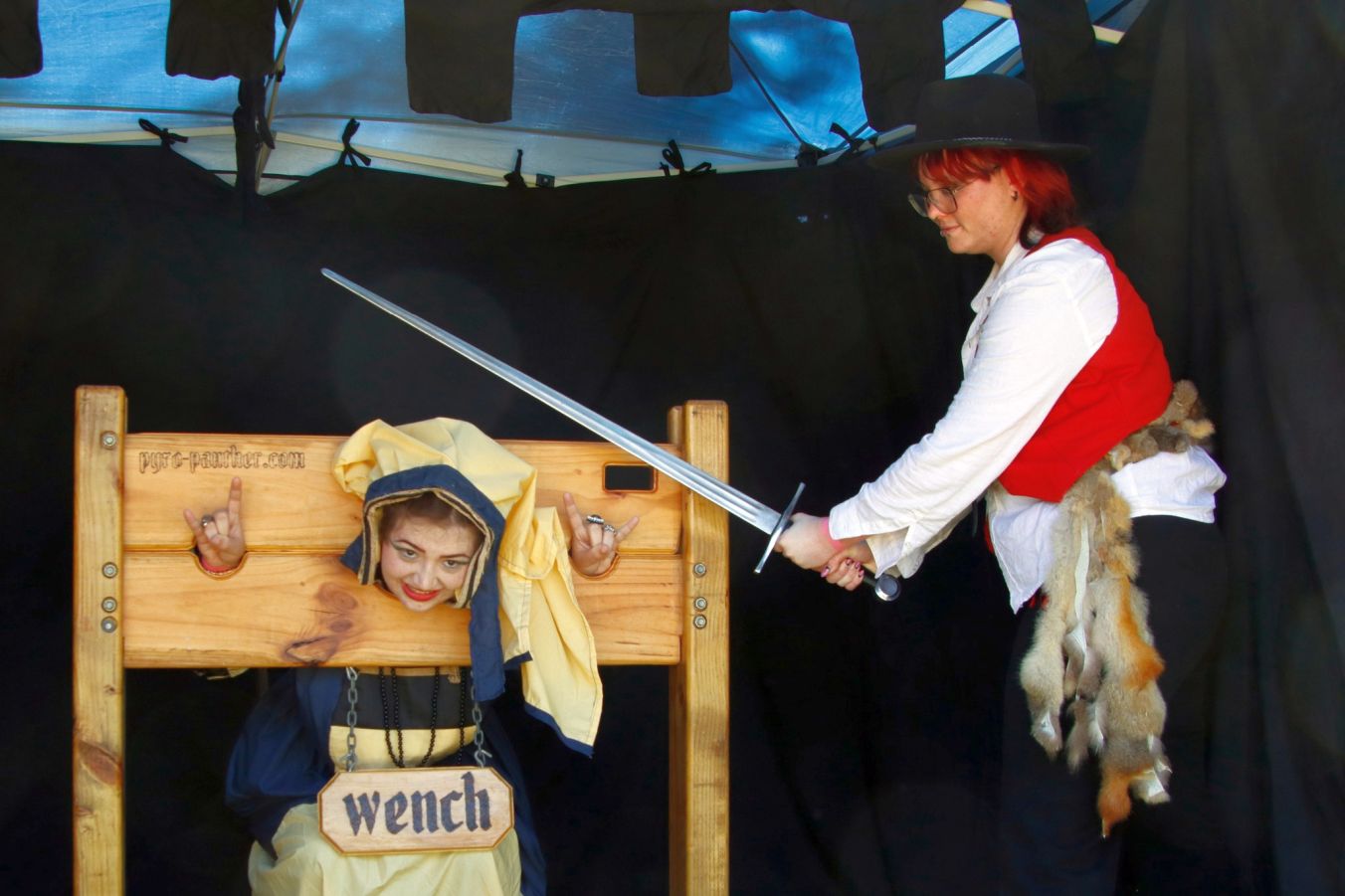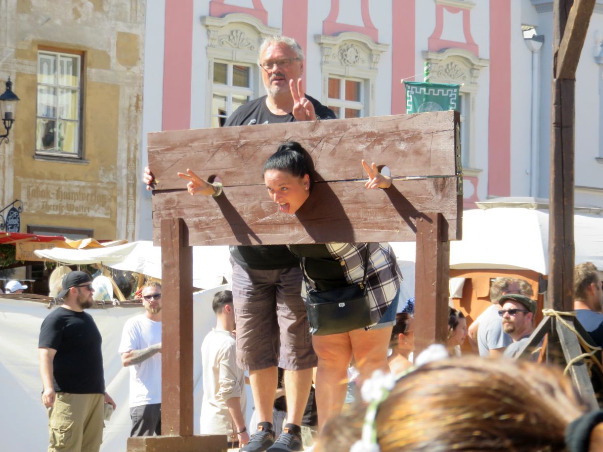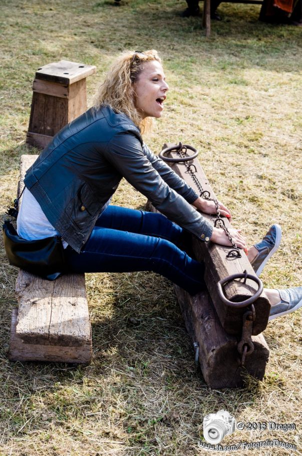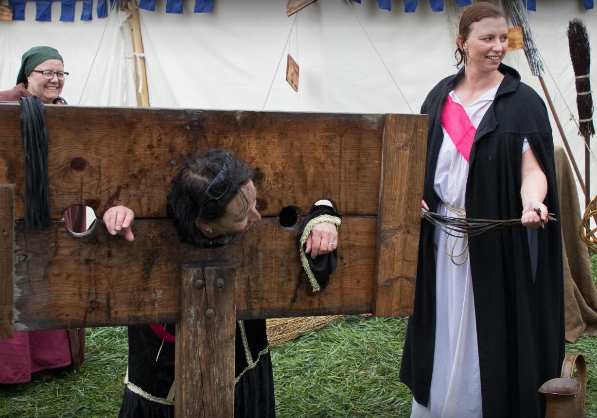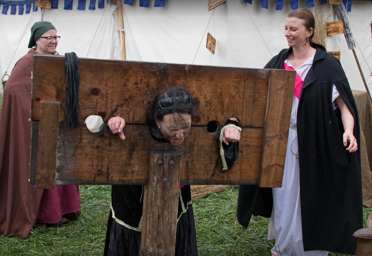 Another French fair. Stuck in a pillory and your hair is a mess? Then you need a visiting medieval hairdresser. A few expert tweaks and she's looking as chic as ever. Voila, c'est magnifique.