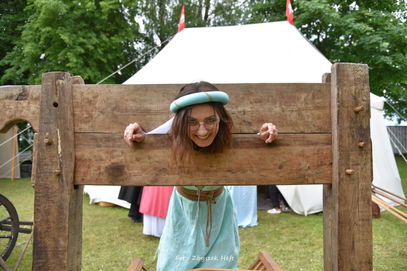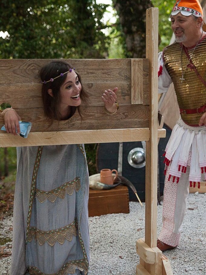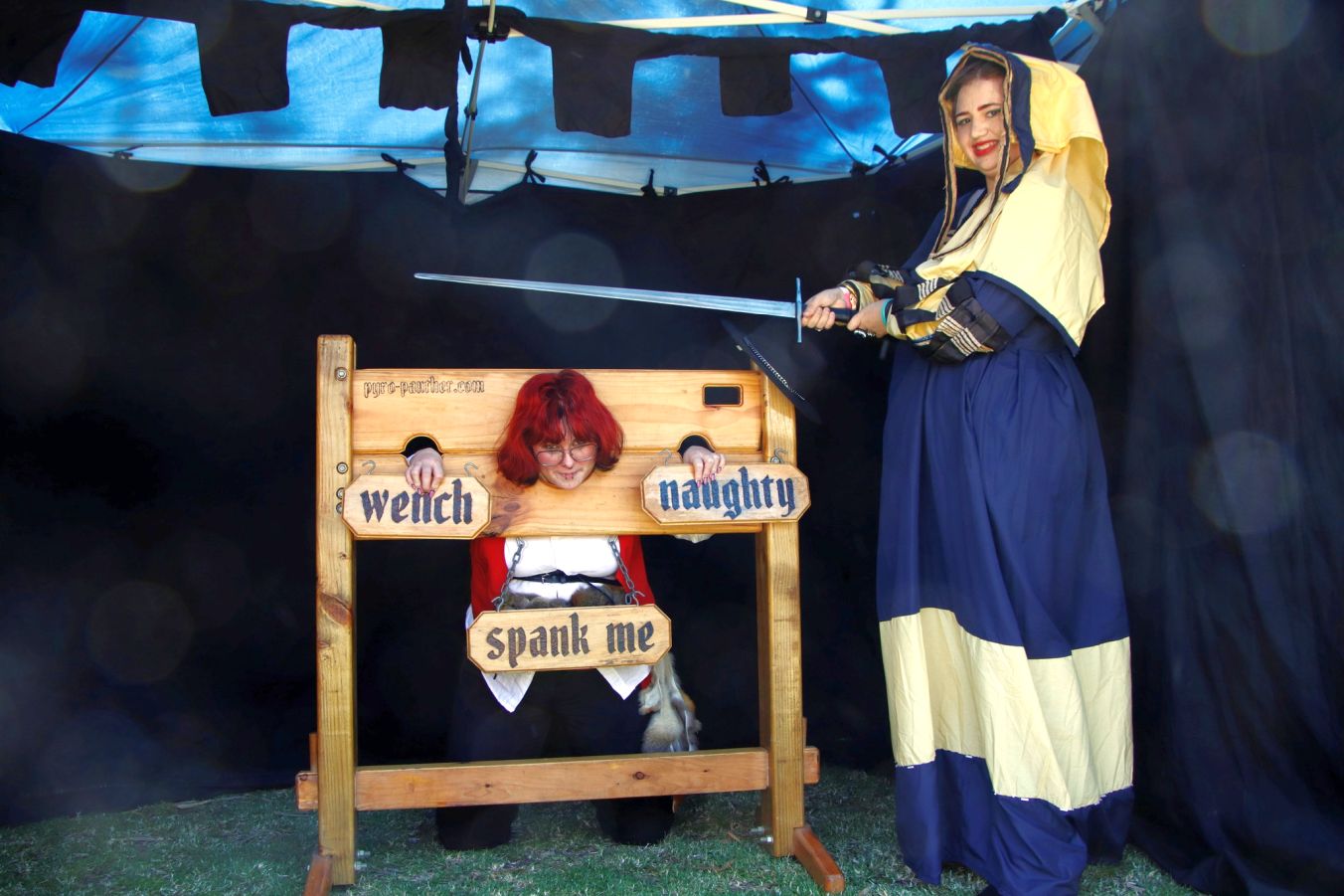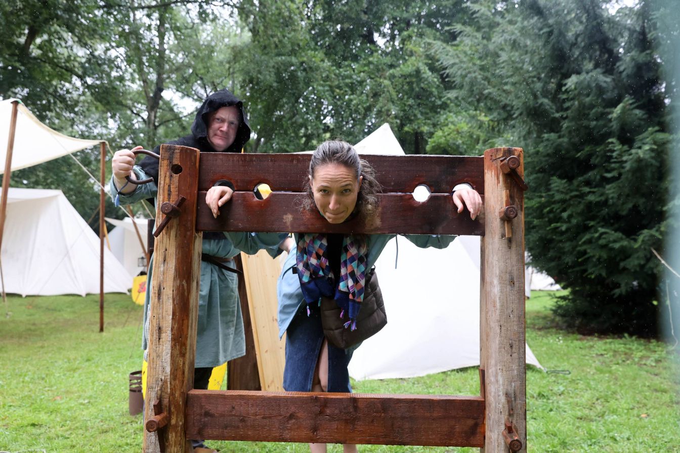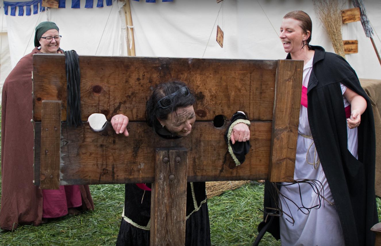 Another French fair. Stuck in a pillory and your hair is a mess? Then you need a visiting medieval hairdresser. A few expert tweaks and she's looking as chic as ever. Voila, c'est magnifique.