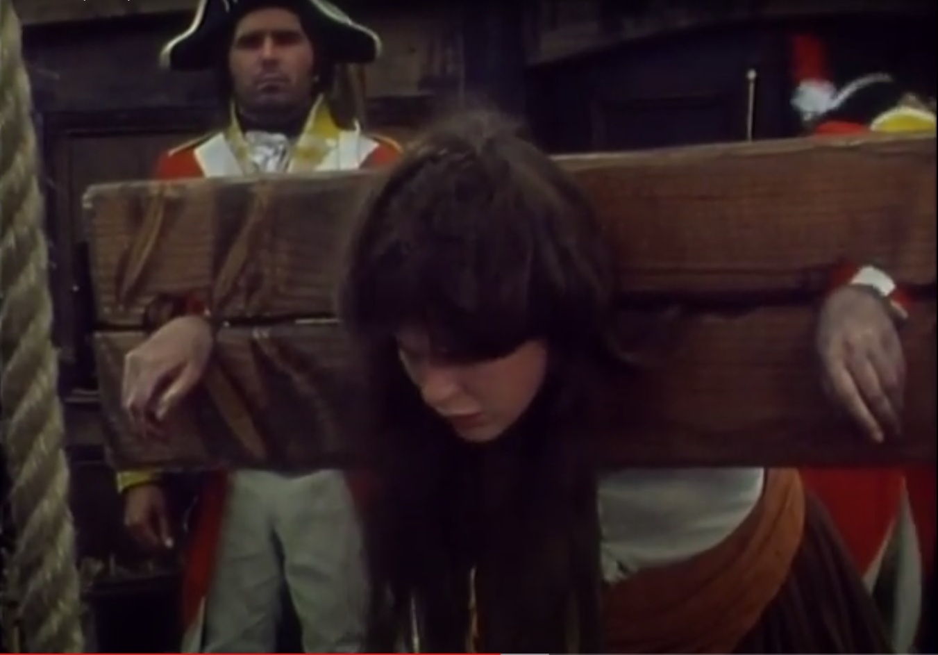 In the film "Mad Wolf", an innocent maiden in the American colonies is locked in a pillory and