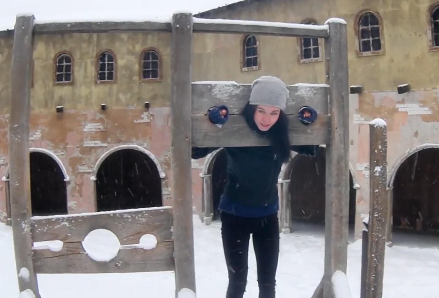 From a Polish television programme, in which one of the presenters (Gosia Godlewska) is trapped in this device after losing a medieval-style duel with the other presenter.
