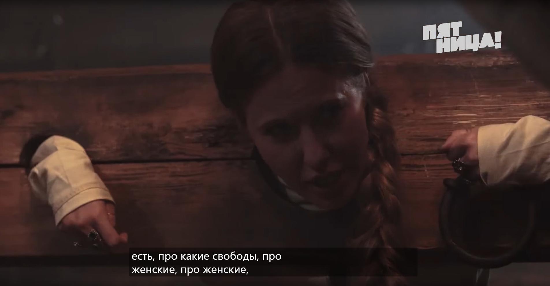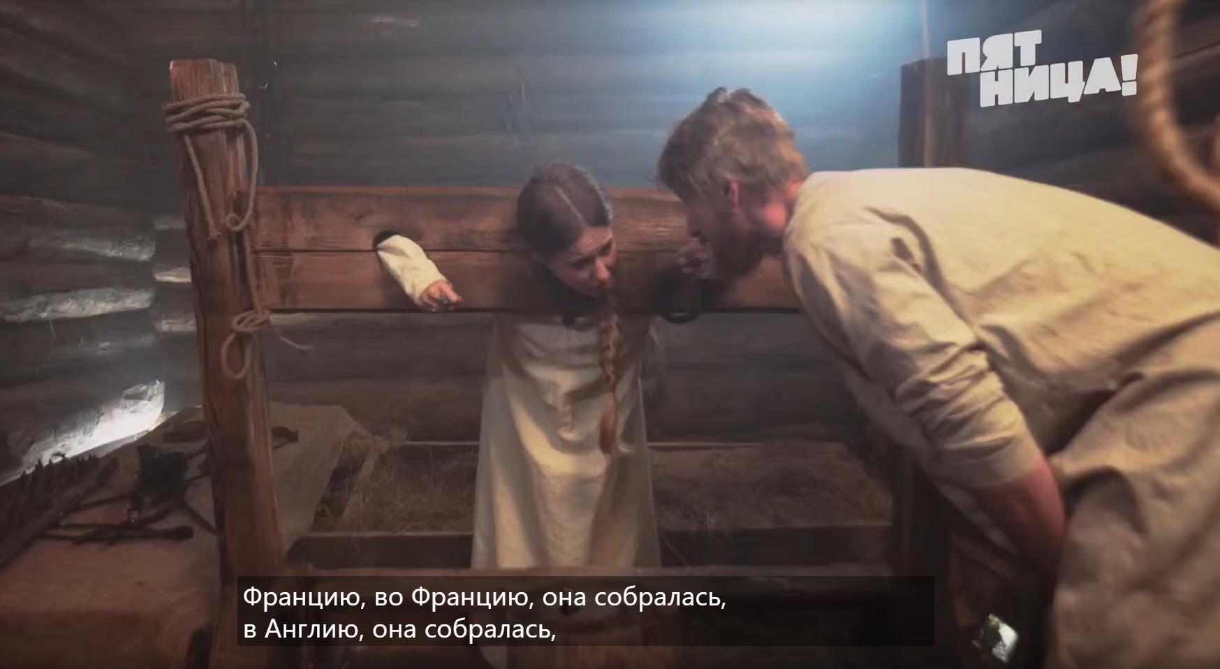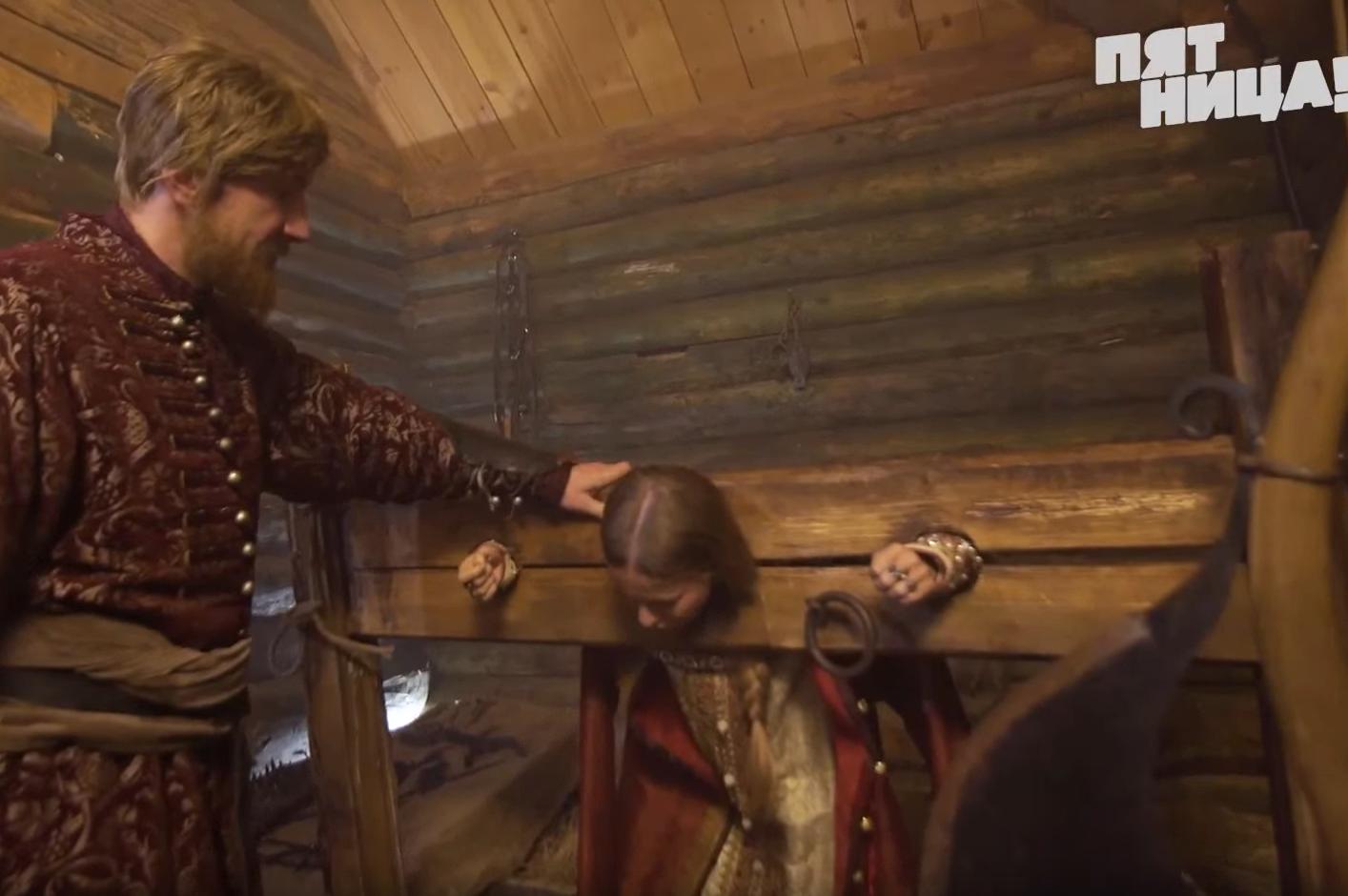 A Slovakian TV chat show called Petra Marcina, in which a guest actress (Henriety Mickovicovej) is put in a shrew's fiddle,
