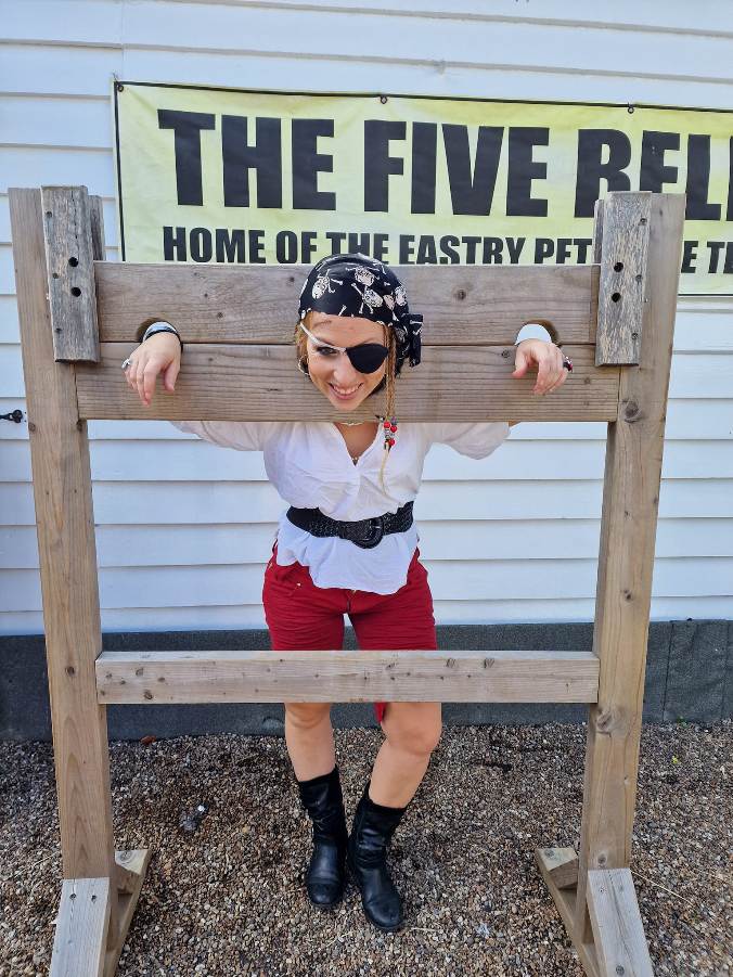 These pictures are from a British TV programme called "I'm a Celebrity....Get Me Out of Here". One of the contestants, Ruthie Henshall, is in a pillory dressed as a jester. She has to read out jokes and her fellow contestant has to find the punchlines, which are concealed in barrels of various disgusting substances. If he fails to find the correct punchline, Ruthie has rotten tomatoes poured on her from an overhead chute. This happens frequently. Ruthie had a total of 225kg of rotten tomatoes dumped on her during this task.