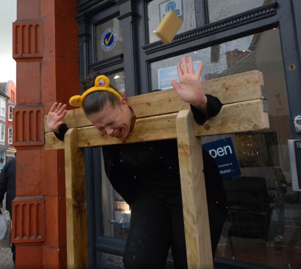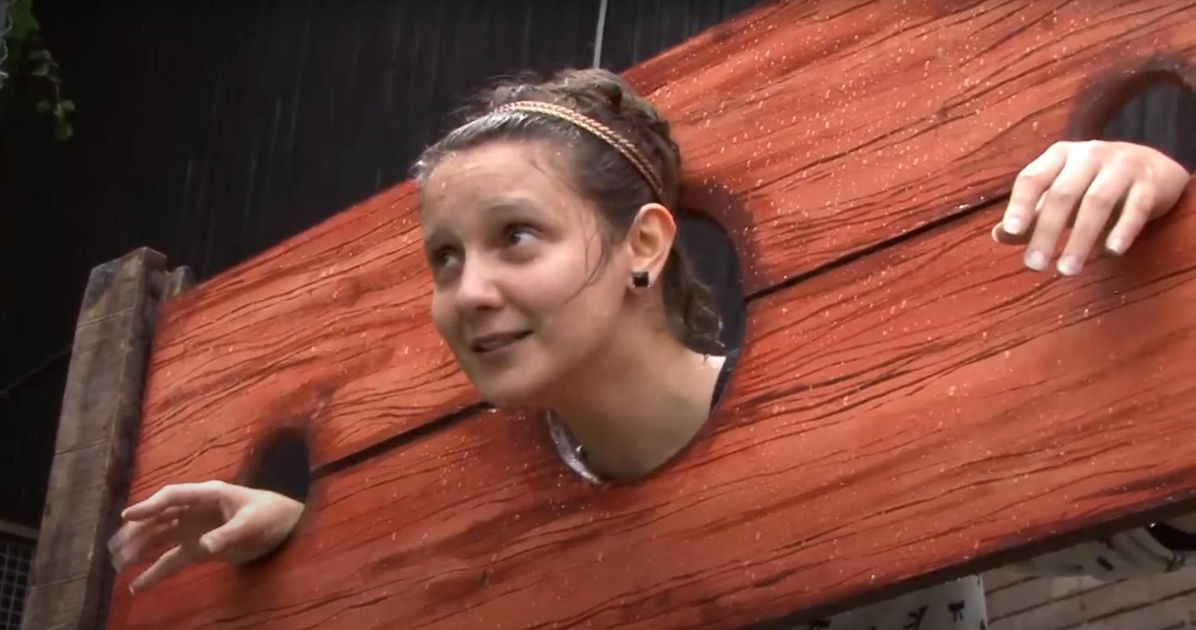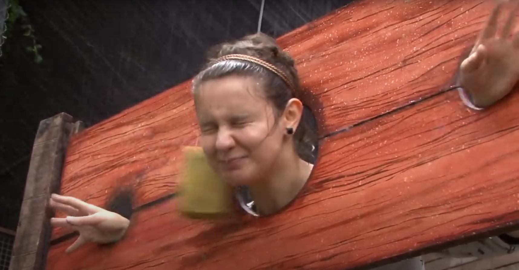 From the UK version of Big Brother. One of the attention-seeking egotists is put in a pillory and has buckets of gunge poured over her. What's not to like?